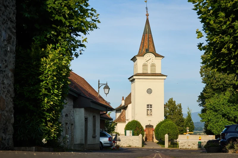 En 1777, on décide de modifier l’orientation de l’église qui “tourne le dos” a son village. On fait appel à Gabriel Delagrange, architecte lausannois d’origine française. Celui-ci donne les plans du clocher porche qui désormais marquera l’entrée de l’église de manière monumentale. Construit en molasse provenant des carrières de Villars-Ste-Croix, ce clocher comporte un rez-de-chaussée, formant vestibule, deux niveaux, puis un étage beffroi, séparé du reste de la tour par un avant-toit lambrissé, élément rare dans notre région.